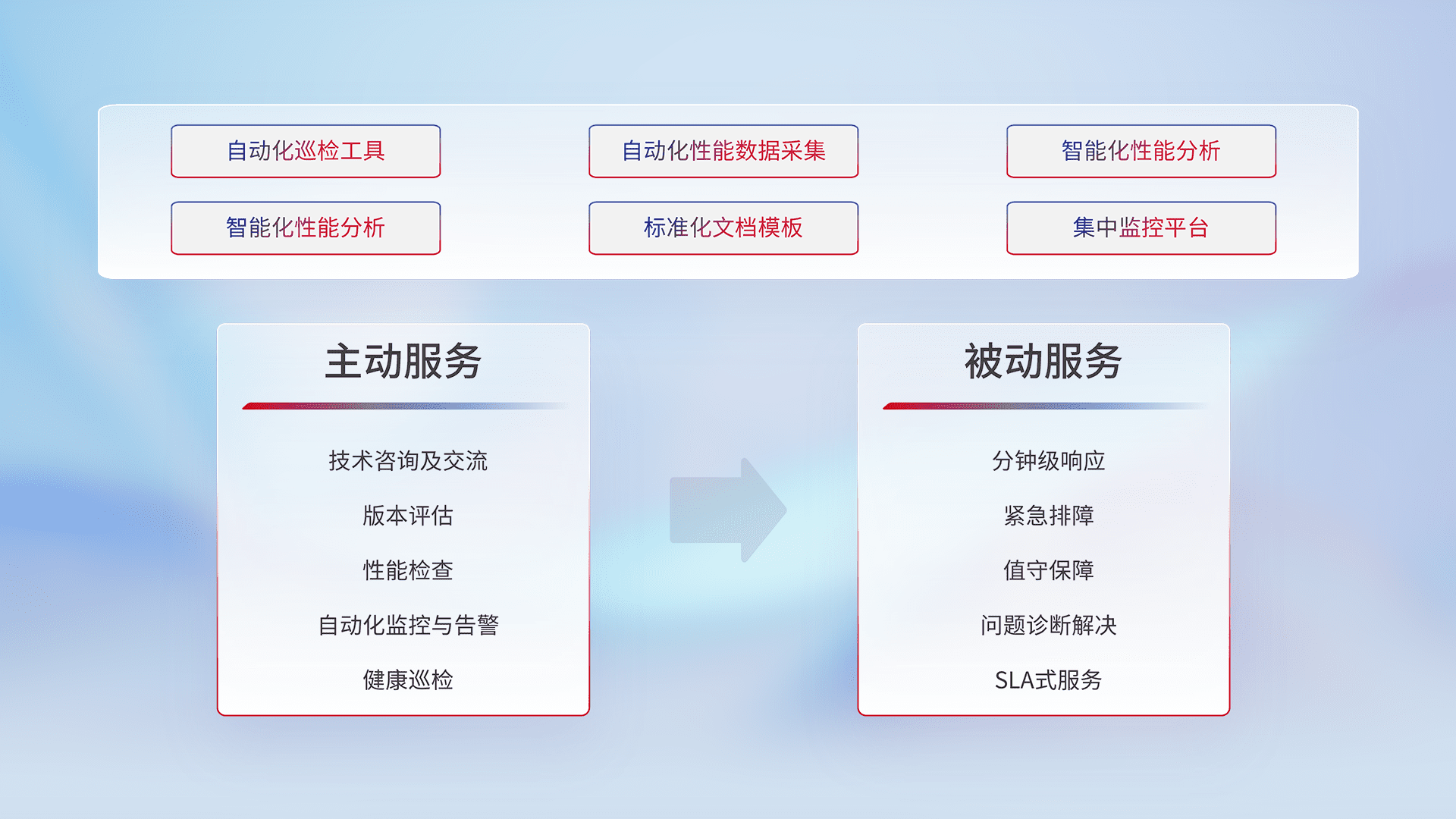 智能化工具和标准化文档,,,,保障服务质量,,提供主动服务(包含技术咨询、、、、版本评估、、、性能检查、、、自动化监控与告警、、健康巡检)和被动服务包含(分钟级响应、、、紧急排障、、、、值守保障、、问题诊断解决、、、、SLA服务)。。。